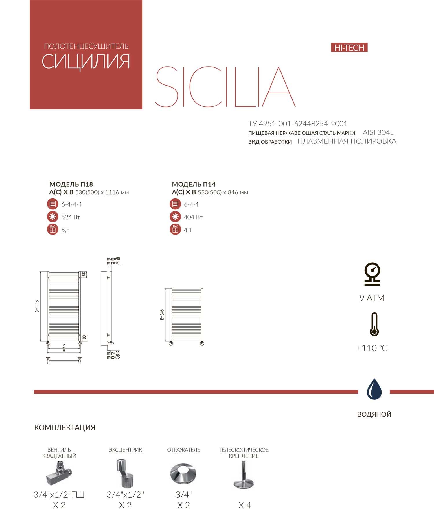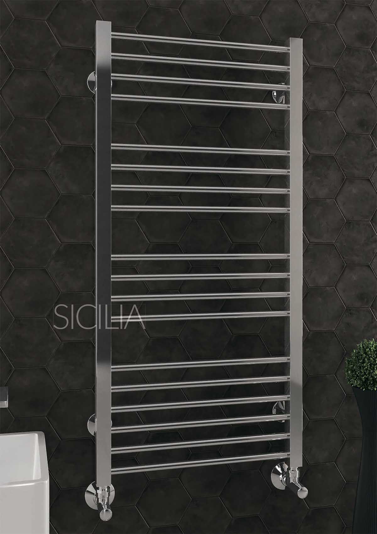 Водяной радиатор «Сицилия» имеет подключение нижнего типа и классическую форму лесенки. Количество перекладин варьируется от 10 до 18, а их удобная группировка делает конструкцию еще более функциональной. Банные и кухонные полотенца, детская одежда, носовые платки – на подобном радиаторе можно сушить абсолютно любые вещи.