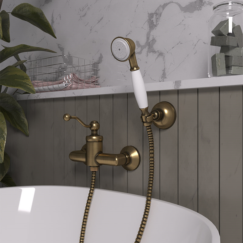 Пожалуй, это наиболее универсальный «винтажный» смеситель, который можно вписать практически в любой интерьер. Лучше всего он безусловно будет смотреться в окружении голубых, серых или насыщенно-синих цветов. При том, что сдержанный и минималистичный интерьер может стать гораздо мягче и теплее в дополнении с таким смесителем. Поэкспериментируйте с мозаикой в восточном стиле или воссоздайте атмосферу Сицилии при помощи матовых белых стен, небесно-голубых или синих махровых полотенец и таким смесителем в винтажном стиле.